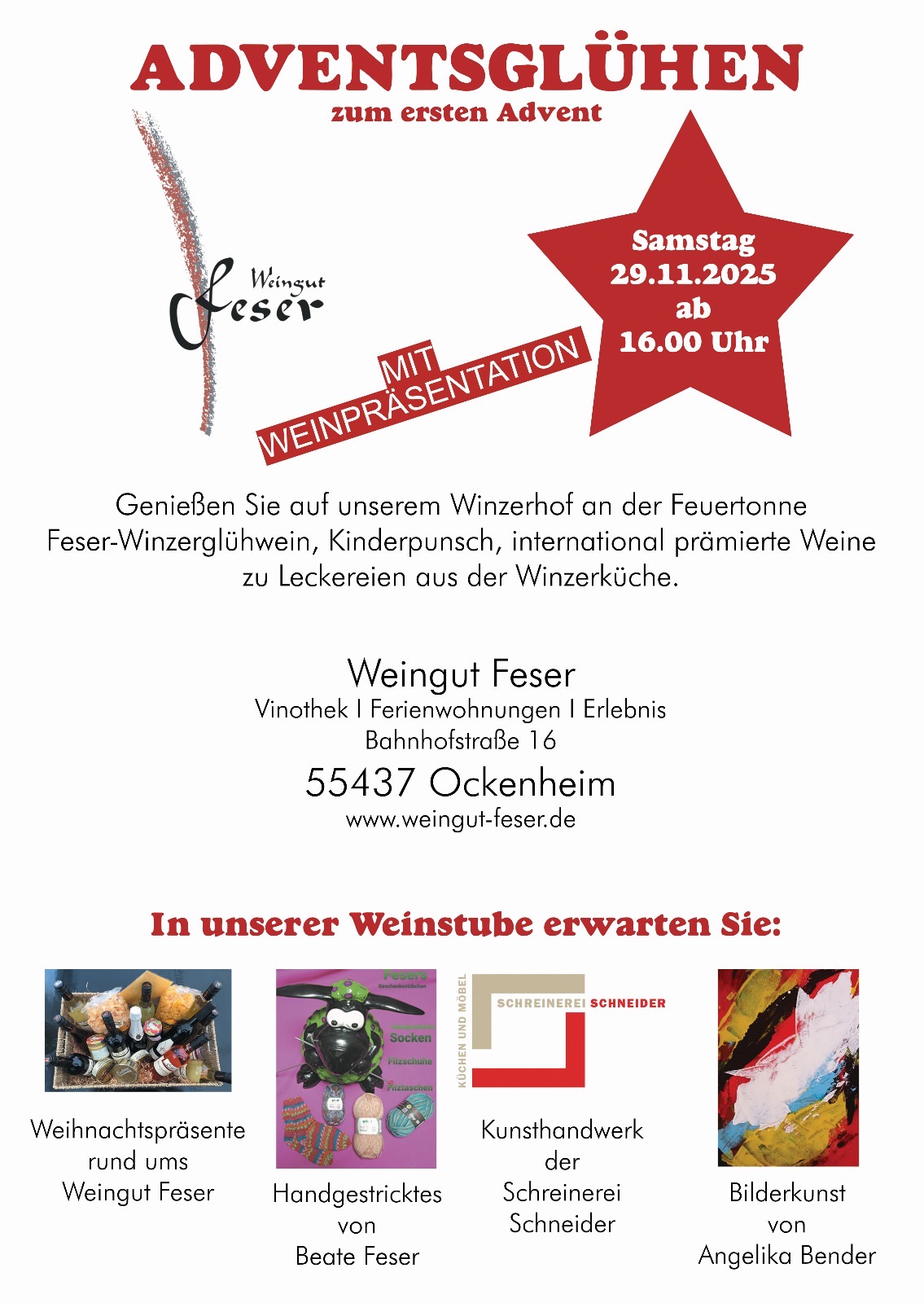 Überzeugen Sie sich bei einem Spaziergang durch die Weinberge über den St. Jakobsberg, dem Balkon Rheinhessens, von der Einzigartigkeit der Landschaft. In der Hochzeit des Frühlings ist auch ein Ausflug in die nahe gelegenen Rheinauen per Pedes oder mit dem Rad sehr reizvoll. Genießen Sie die Ruhe in der Saunalandschaft der Rheinwelle (Nachbarort). Verbringen Sie gemütliche Stunden auf unserem Winzerhof und probieren Sie die Feser-Weine vor Ort. Lassen Sie die erlebnisreichen Tage bei typisch rheinhessischen Feser-Spezialitäten ausklingen und träumen Sie in unseren Ferienwohnungen mit Blick in den Sternenhimmel vom vergangenen Tag.